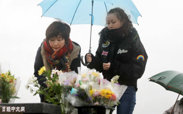 | 來到慰靈碑進行祭奠的人們(11日上午,仙台市若林區) |