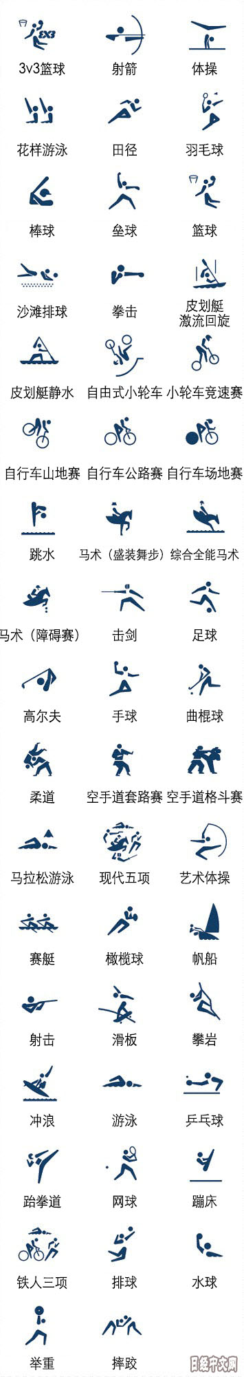3月12日,距離2020年東京奧運會開幕還有500天,東京奧組委公佈了50種用圖形代表比賽項目的圖標。這些圖標將用於官方商品、賽場裝飾、門票、奧運會指導手冊等。據介紹,圖標的特點是,以首次在奧運會中引進圖標的1964年東京奧運會的圖標為基礎,簡潔地表現了運動員的動作。