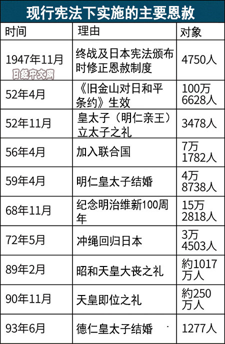 1989年因昭和天皇去世實施的恩赦以違反《道路交通法》和《輕犯罪法》等法律的人為對象,將殺人、放火和搶劫犯等排除在外。1990年因天皇即位實施的恩赦也主要面向《道路交通法》的違反者。在1993年的恩赦對象中,《公職選舉法》違反者佔4分之3。