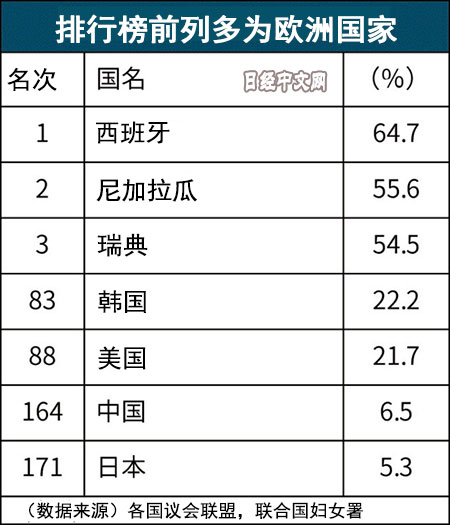 聯合國的數據顯示,截至2019年1月,從部長級職位上的女性比例來看,日本為5.3%,在納入調查對象的188個國家和地區中排在第171位。與2017年的上次調查(第106位)相比,日本的排名大幅下降,低於南韓(第83位)和中國(第164位)等。在女性佔國會議員的比例上,日本排名在各國和地區中也較低,女性參政與沒有進展的現狀再次浮出水面。