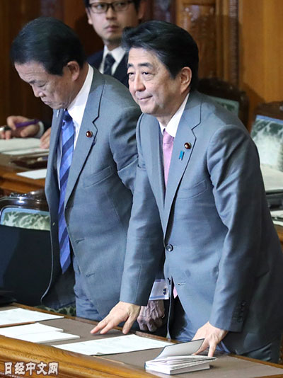 | 在參議院全體會議上通過預算案後起立致意的日本首相安倍晉三等(27日) |
