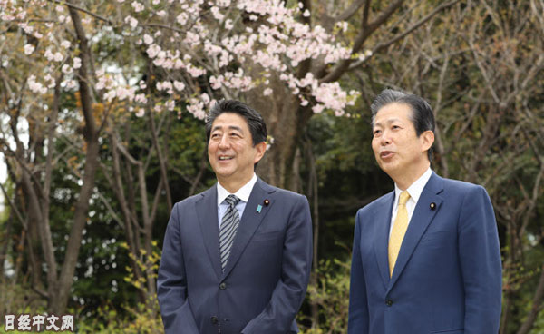 | 安倍(左)和山口(右)一起欣賞櫻花(3月28日) |