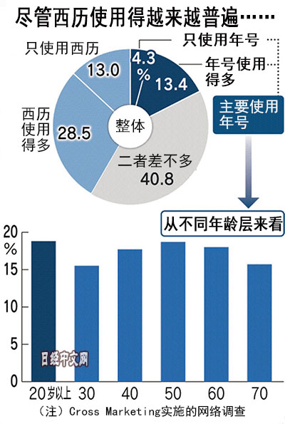 日本Cross Marketing調查公司2018年11月以日本各地20~79歲的3千名男女為對象實施了網路調查,結果發現西歷派的比例遠遠高於年號派。「主要使用西歷」的回答佔到41.5%,「主要使用年號」的回答佔到17.7%。