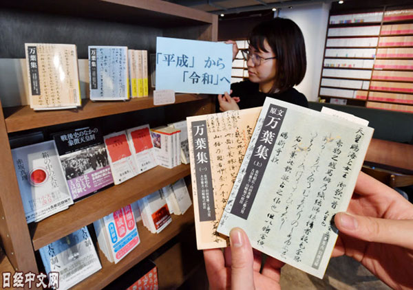 在東京都內的書店,2日出現了介紹譯為現代日語的《萬葉集》文庫本等的櫃檯。為應對書店陸續訂購,出版社也決定再版。