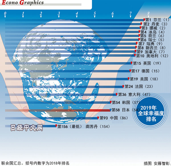 哪些國家和地區的人感覺幸福呢?聯合國發佈的《2019年全球幸福報告》顯示,日本在156個國家和地區中排在第58位,比上次調查下降4位,在七大工業國(G7)中排名墊底。本次調查中,以連續2年位居第一的芬蘭為首,社會保障制度完善的北歐國家排名靠前。