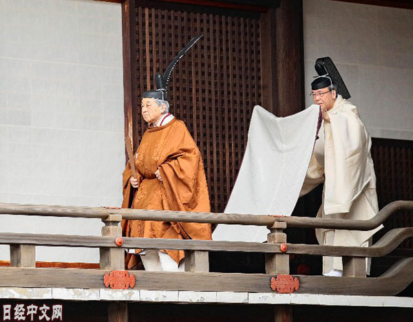 明仁天皇退位當日在皇居宮中三殿參加「退位禮當日賢所大前之儀」(4月26日)