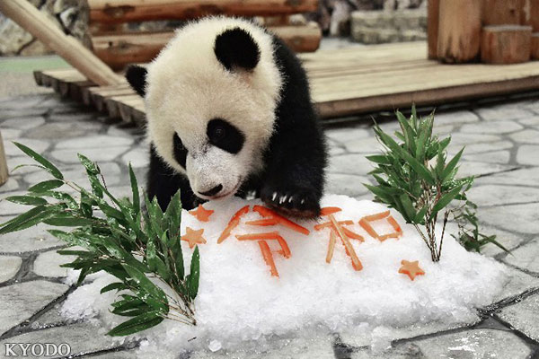 生活在日本和歌山縣白浜町的「冒險大世界」的大熊貓「彩浜」和用胡蘿蔔擺成的「令和」字樣(提供圖片)