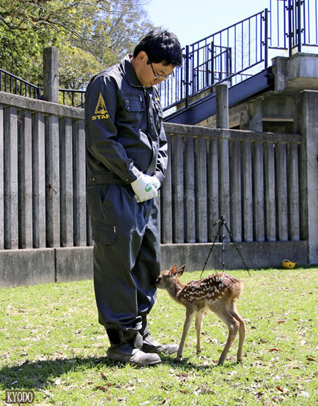 | 「奈良愛鹿會」工作人員飯尾英郎與鹿寶寶(7日下午,奈良市,kyodo) |