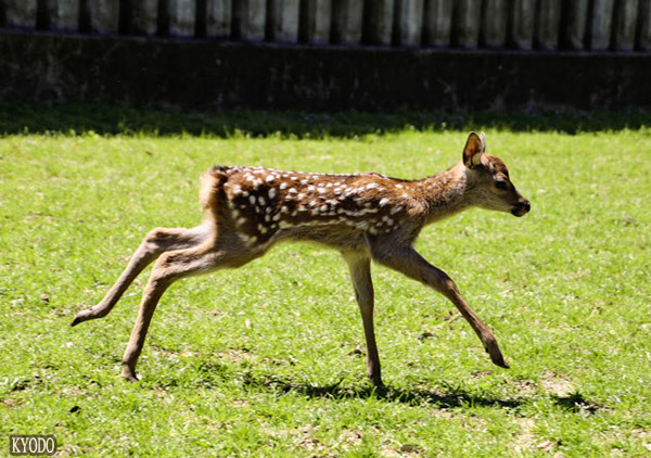 | 小鹿在草地上奔跑跳躍(7日下午,奈良市,kyodo) |
