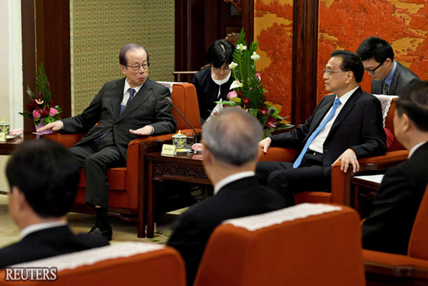 | 2018年10月10日在北京市與中國政府總理李克強(右起第3人)舉行會談的日本前首相福田康夫(左起第2人)(左,reuters) |