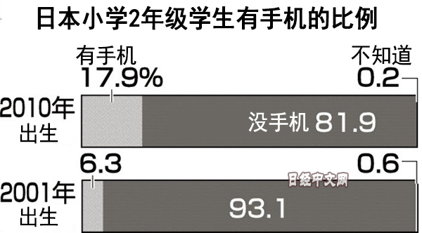 日本經濟新聞(中文版:日經中文網)從日本厚生勞動省實施的「21世紀出生兒縱斷調查」中獲悉,2010年出生、去年上小學2年級的兒童中,17.9%的人有手機,和2001年出生的兒童上小學2年級時相比提高了11.6個百分點。