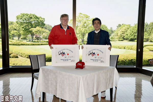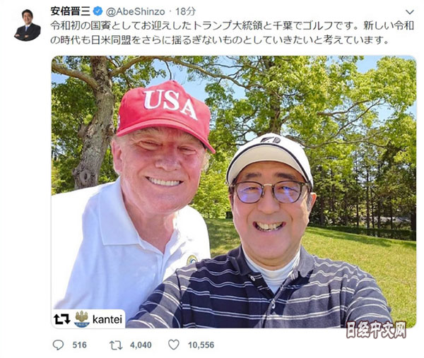 日本首相安倍在推特上表示「與作為令和首位國賓到訪的川普總統一起在千葉打高爾夫。希望在新的令和時代,使日美同盟進一步變得難以動搖」。安倍發佈了和川普一起拍攝的照片。