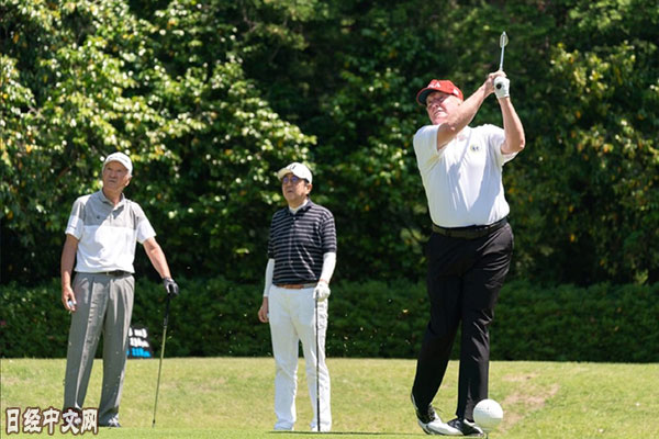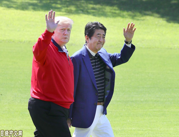 川普將與安倍打高爾夫的照片發到推特。日本職業高爾夫球手青木功陪同兩位首腦打了高爾夫。青木曾獲邀參加川普201711月訪日之際的晚宴。當時,川普稱讚了青木的輕擊球技術,因此日本政府此次也邀請青木參加。兩位首腦總計打了16洞。由於為專機的起降而關閉了球場的一部分,因此據稱並非18洞。下午018分結束,吃了午餐。午餐是川普愛吃的漢堡包。