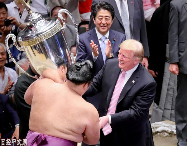 川普夫婦在東京兩國國技館與安倍夫婦一起觀看了大相撲夏季賽事最後一天比賽「千秋樂」。坐的並非2樓的貴賓席,而是坐在土俵附近的「升席」的椅子上。