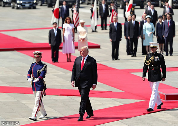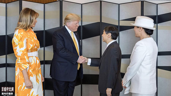 川普總統夫婦在上午9點多,乘坐專車抵達皇居宮殿。日本天皇夫婦在門廊處迎接,並面帶笑容的與總統夫婦握手。在歡迎活動中,演奏了美國國歌和日本國歌君之代,川普接受了日本陸上自衛隊儀仗隊的榮譽禮。