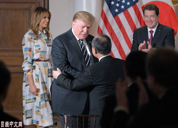 川普與日本經濟界人士的會議有軟銀集團會長兼社長孫正義等約30人受邀參加。川普步入會場,與身邊的軟銀集團孫正義握手。演講結束後,孫正義再次面帶笑容走向川普。