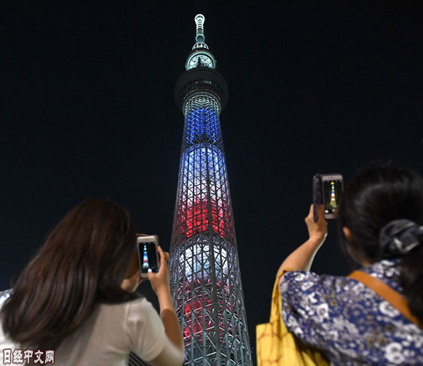 配合川普訪日,東京晴空塔被打上了表現美國國旗顏色的燈光。