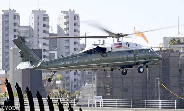 川普26日上午8點半前後,從美國陸軍基地「赤坂新聞中心」乘坐總統專用直升機「海軍一號(Marine One)」前往千葉縣的高爾夫球場。