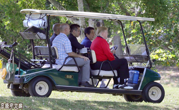 安倍親自駕駛載著川普的高爾夫球車,駛向俱樂部更衣室。兩位首腦吃過麵包和培根煎蛋的早餐之後,開始打高爾夫。這是兩位首腦第5次一起打高爾夫。