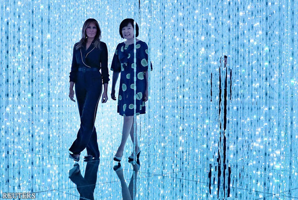 安倍昭惠夫人和川普夫人梅拉尼婭視察了位於東京台場的數字藝術專門美術館。欣賞了採用數位技術的藝術。