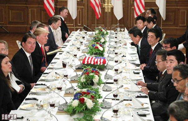 川普和安倍結束閉門會談之後,通過增加同席者的工作午餐,繼續展開磋商。