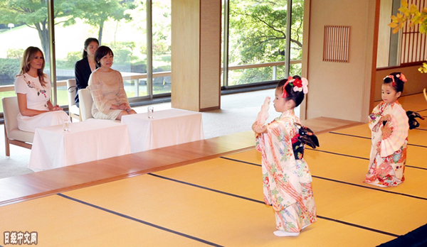 川普夫人梅拉尼婭27日上午在東京元赤坂的迎賓館與安倍夫人昭惠一起觀賞了孩子們表演的日本舞蹈。兩人隨後共進午餐。日本外務省表示「是實現和洋融合的功能表」。