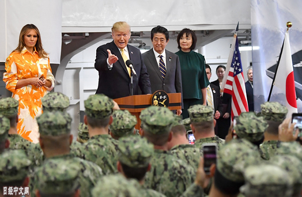 川普登上日本海上自衛隊護衛艦「加賀號」,並在自衛隊和駐日美軍面前進行了訓示。川普提到,「加賀號」可以搭載美國製造的隱形戰機F35B,「將從各種複雜的威脅中防護該地區和更加廣闊的地方」。