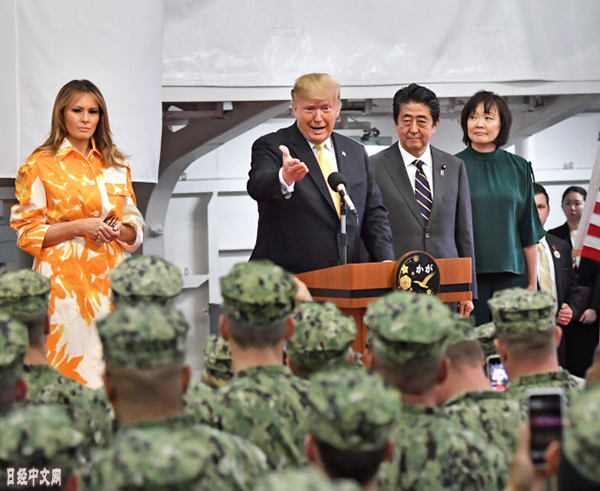 川普和安倍分別乘坐直升機在「加賀號」甲板上降落。之後在倉庫裏面對日本海上自衛隊隊員和美軍橫須賀基地士兵發表了訓示。