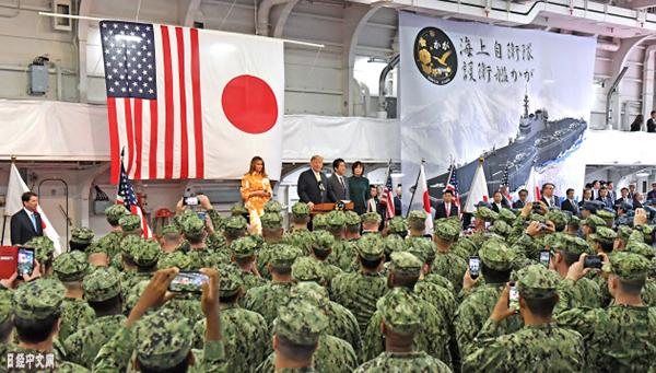 美國總統川普5月28日與日本首相安倍晉三一同登上海上自衛隊護衛艦「加賀」號,向國內外彰顯了穩固的日美同盟關係。這是美國總統首次登上日本海上自衛隊的艦艇。川普高度評價日本購買美國産隱形戰鬥機F35B,並就「加賀」號事實上的航母化強調將成為兩國在廣泛區域免受各種複雜威脅的幫助。