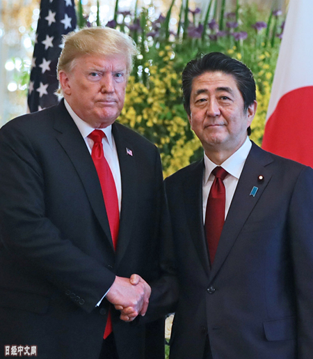 | 川普與安倍在會談伊始握手(27日,東京) |
