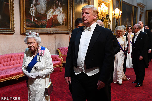 川普3日與夫人梅拉尼婭一起造訪白金漢宮,與女王進行交流,並參加了歡迎儀式。川普欣賞了英國王室擁有的美術品,在威斯敏斯特大教堂向無名戰士之墓獻花。