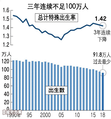 日本厚生勞動省同一天發佈的2018年人口動態統計包括了上述數字。同年出生的嬰兒數(出生數)為91萬8397人,創出歷史最少。比上年減少2萬7668人。出生率與2005年創出的1.26相比處於較高水準,但女性人口正在減少,出生數持續下降,連續3年低於100萬人。