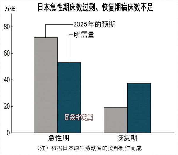 日本的病床出現供需不匹配現象。據日本厚生勞動省統計預測,到2025年面向重症患者的「急性期病床」與其需求量相比超出18萬張,而康復用的「恢復期」病床數不足18萬張。高齡患者的康復需求提高,病床的使用轉換卻沒有進展。高額的急性期病床若持續超出需求的話,日本的醫療費用有膨脹的可能。