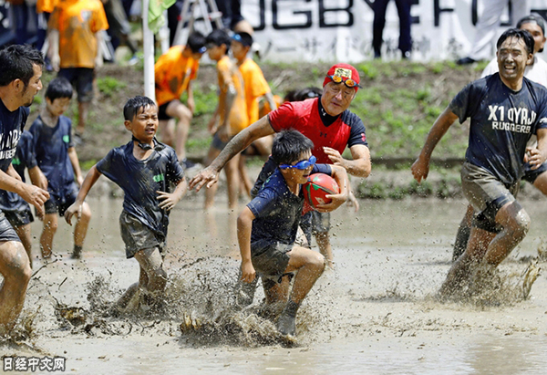 在還未插秧的水田進行橄欖球比賽的「水田橄欖球」賽于6月16日在京都市伏見區舉行,約400人在泥地裏展開了激烈爭奪。