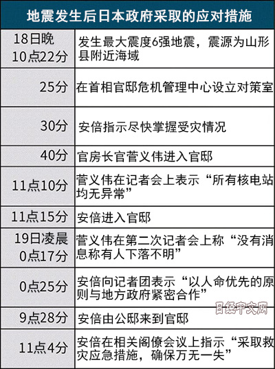 日本政府在18日晚10點22分發生地震3分鐘之後,立即在首相官邸的危機管理中心設立了官邸對策室。當時安倍身在官邸旁的首相公邸,在晚上10點半下達了「儘快掌握受災情況」等指示。地震發生18分鐘後,官房長官菅義偉進入官邸。