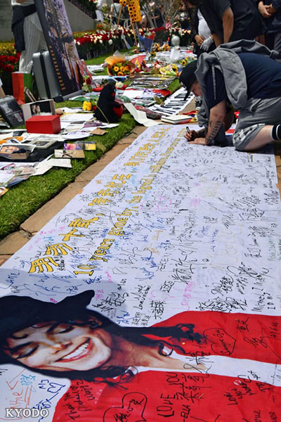粉絲在追悼橫幅上留言(25日,美國加利福尼亞州格倫代爾,Kyodo) |