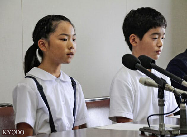 | 被選為宣讀「和平誓言」的兒童代表的金田秋佳(左)和石橋忠大(7月10日上午,廣島市政府,Kyodo) |