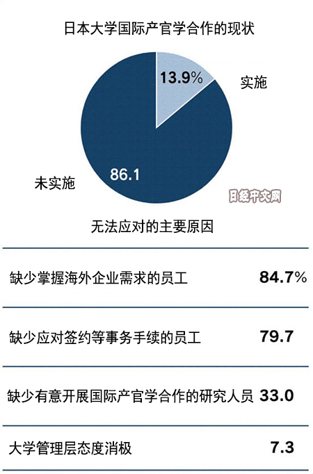 除了與企業的合作外,日本的大學之間以及與政府部門的合作也停滯不前。日本內閣府的調查顯示,關於與海外企業、學校、政府的合作,回答「實施」的僅佔13.9%,回答「未實施」的達到86.1%。其背景是,日本的大學等缺少掌握海外企業需求,處理簽約等工作的人才。