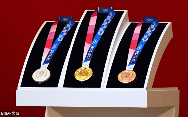 在距離2020年東京奧運會開幕倒計時1年的7月24日,東京奧組委公開了將頒發給運動員的金銀銅牌。獎牌採用簡潔的設計,方格圖案的奧運會徽被立體的環形環繞。獎牌設計以光輝為主題,在環形上加入了渦狀的刻痕,容易反射光芒。