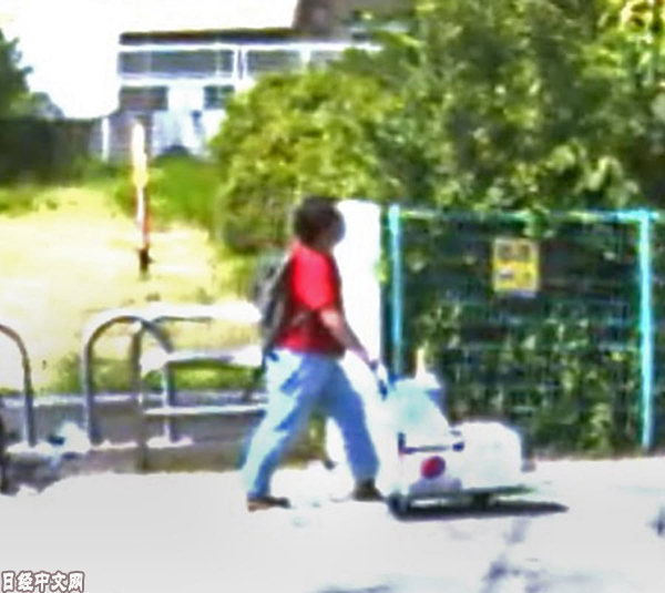 | 監控攝影機拍下疑似青葉的人物推著手推車在京都動畫公司附近行走(附近居民提供) |