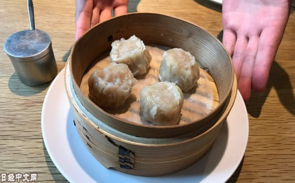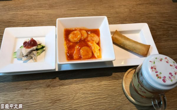 儘管是盂蘭盆節的中午,但店內仍然座無虛席。中午的推薦餐品是拼盤套餐(不含稅價1600日元,約合人民幣106元)。該套餐包括三道前菜,主食可以自選。當天的前菜是梅子醬拌雞肉、乾燒蝦仁、春捲。還配有茉莉花茶及普洱茶等。