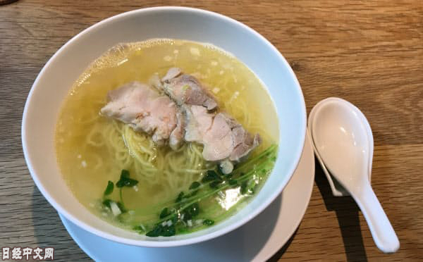 拼盤套餐還能加點4個燒賣(含稅價650日元,約合人民幣43元)。記者選擇的主食是「鹽味雞肉麵」,味道清爽溫和。