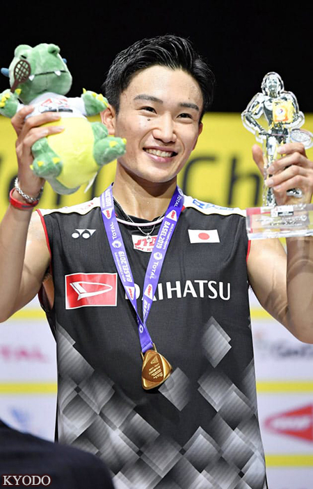 | 桃田賢斗在領獎臺上露出笑容(kyodo) |