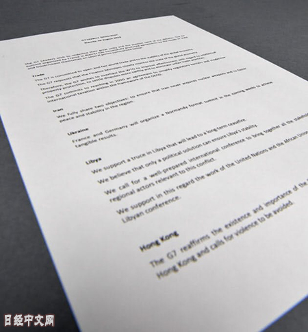 僅為1頁的宣言文件的名稱是「G7 Leaders' Declaration」。直譯是與以往相同的「首腦宣言」,但內容和分量明顯很少。僅限於貿易、伊朗、烏克蘭、利比亞和香港等5個議題簡短提及。