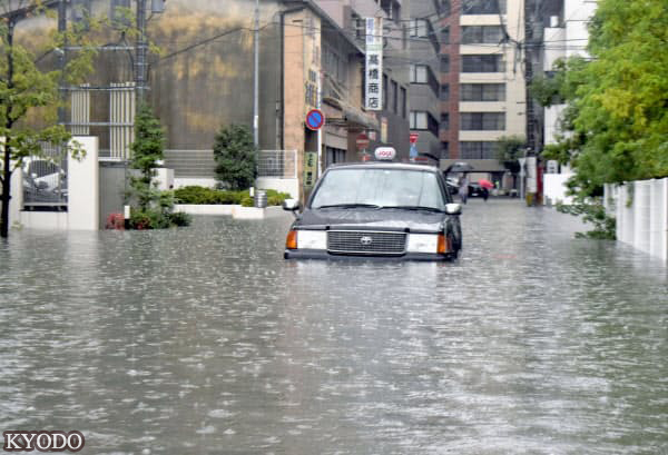 | 28日上午的佐賀市某處,道路和車輛等被水淹(kyodo) |