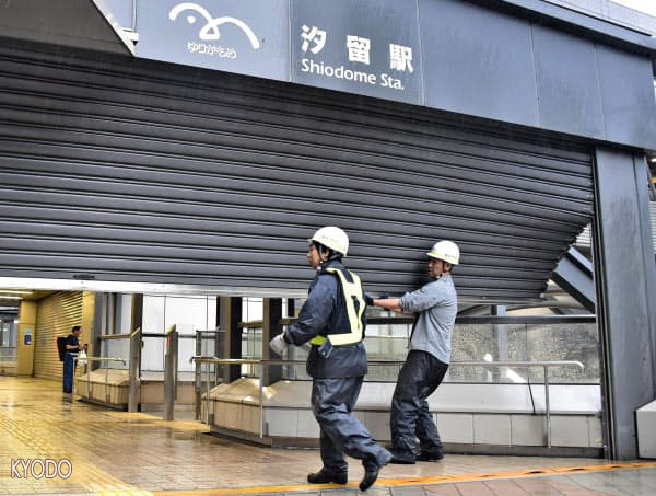 | 15號颱風導致一部分捲曲的「百合海鷗號」汐留站的捲簾門(9日上午,東京都港區,kyodo) |