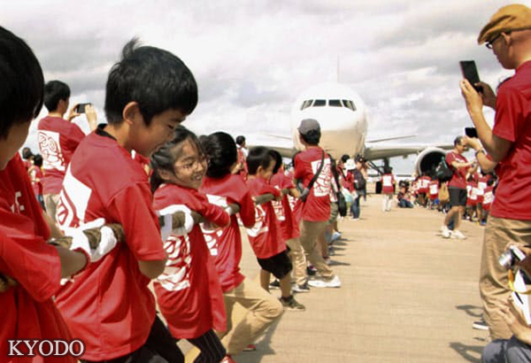 此次的飛機是長約55米、重約97噸的波音767。前輪和左右主輪上各綁上了約70米的繩子,由小學生們來拉拽。
