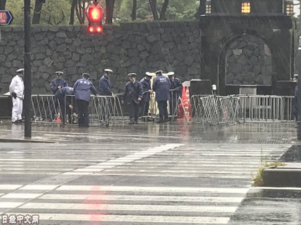 | 在東京站周邊通往皇居的行幸路進行交通管制的東京警視廳的警員(10月22日上午8點20分) |