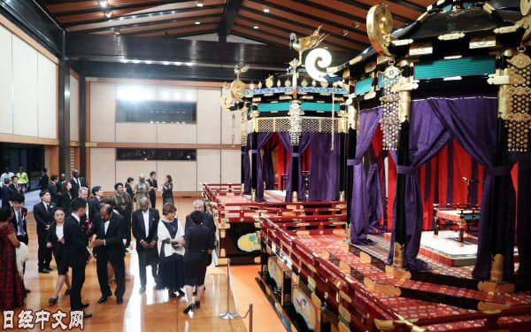 出席者首先在皇居宮殿「竹之間」與天皇夫婦互致問候。然後來到白天天皇宣告即位的「即位禮正殿之儀」的舞臺、宮殿內規格最高的「松之間」,參觀了天皇登上的高御座和皇后的御帳台。