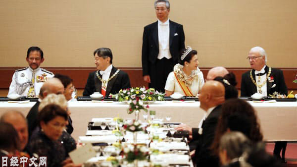 天皇身穿燕尾服,皇后身穿長裙,頭戴皇冠,與查爾斯王儲、西班牙國王費利佩六世夫婦和比利時國王菲利普夫婦等各國王室成員等,不經過翻譯進行了暢談。